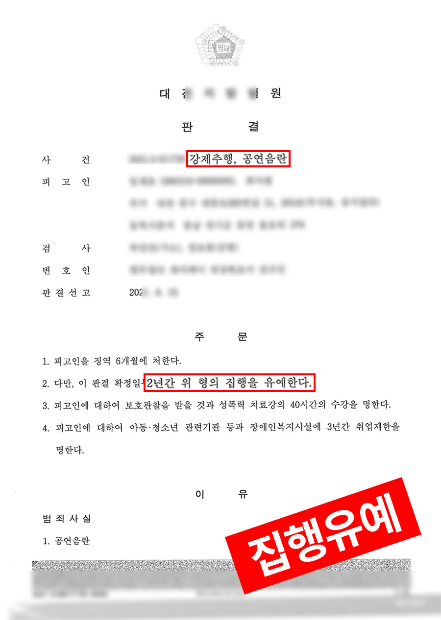 유예한다는 처분과 보호관찰, 성폭력 치료강의 40시간 수강, 취업 제한 명을 내렸습니다.